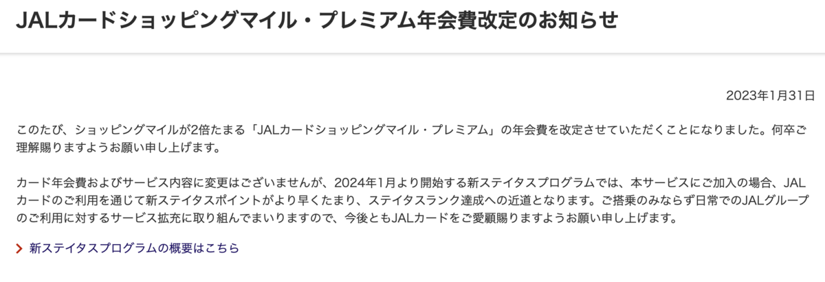 このショッピングマイル・プレミアムサービスは2024年1月から開始されるJAL新ステイタスプログラムでの新ステイタスポイント獲得に有利になるような記述も見られますので、今回値上げはありましたが、引き続きショッピングマイル・プレミアムについては継続して様子を見ていくつもりです。